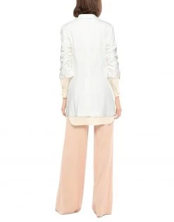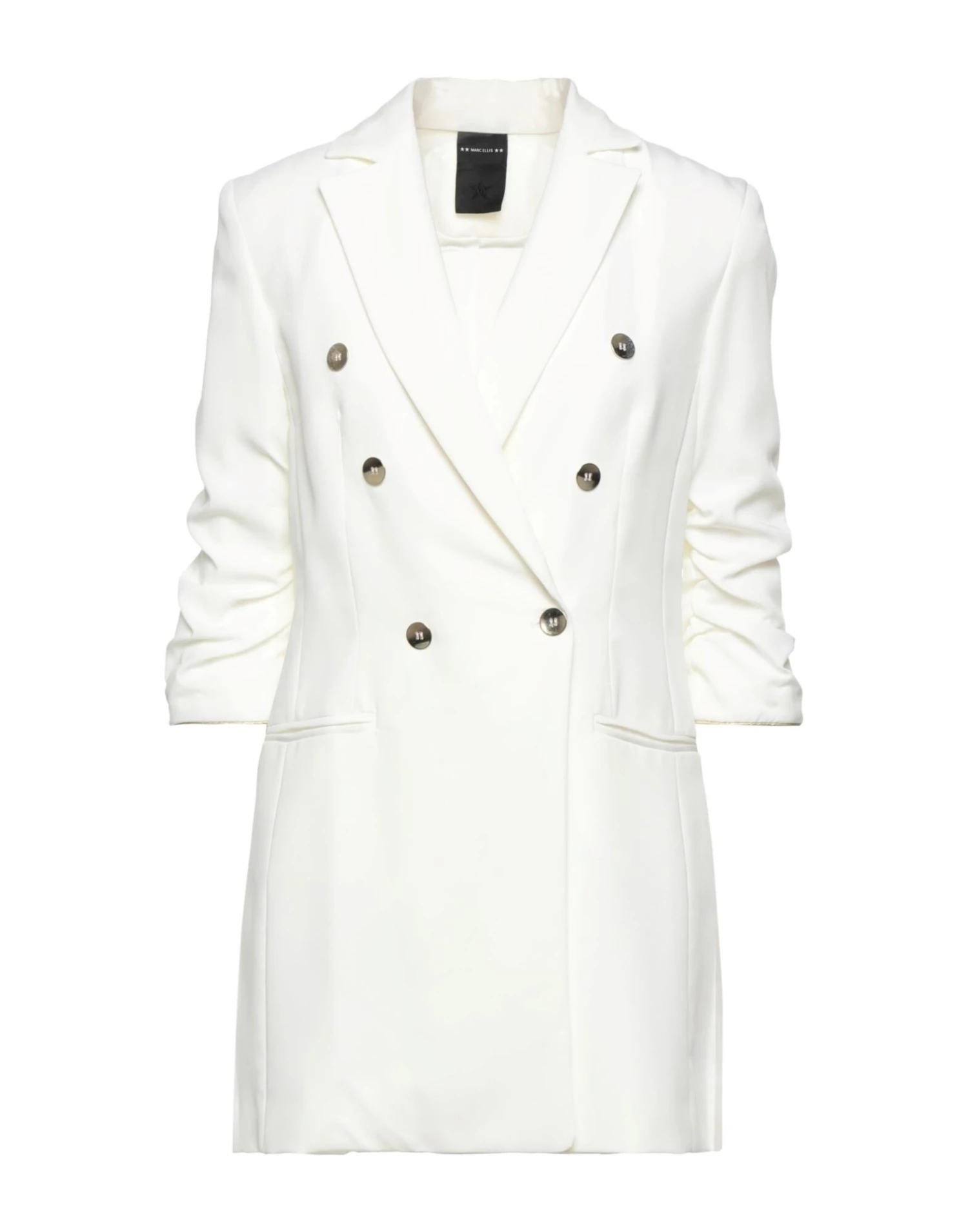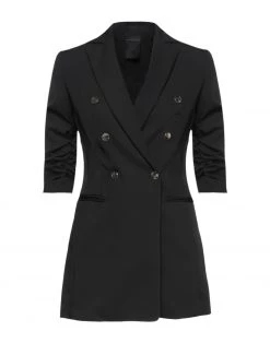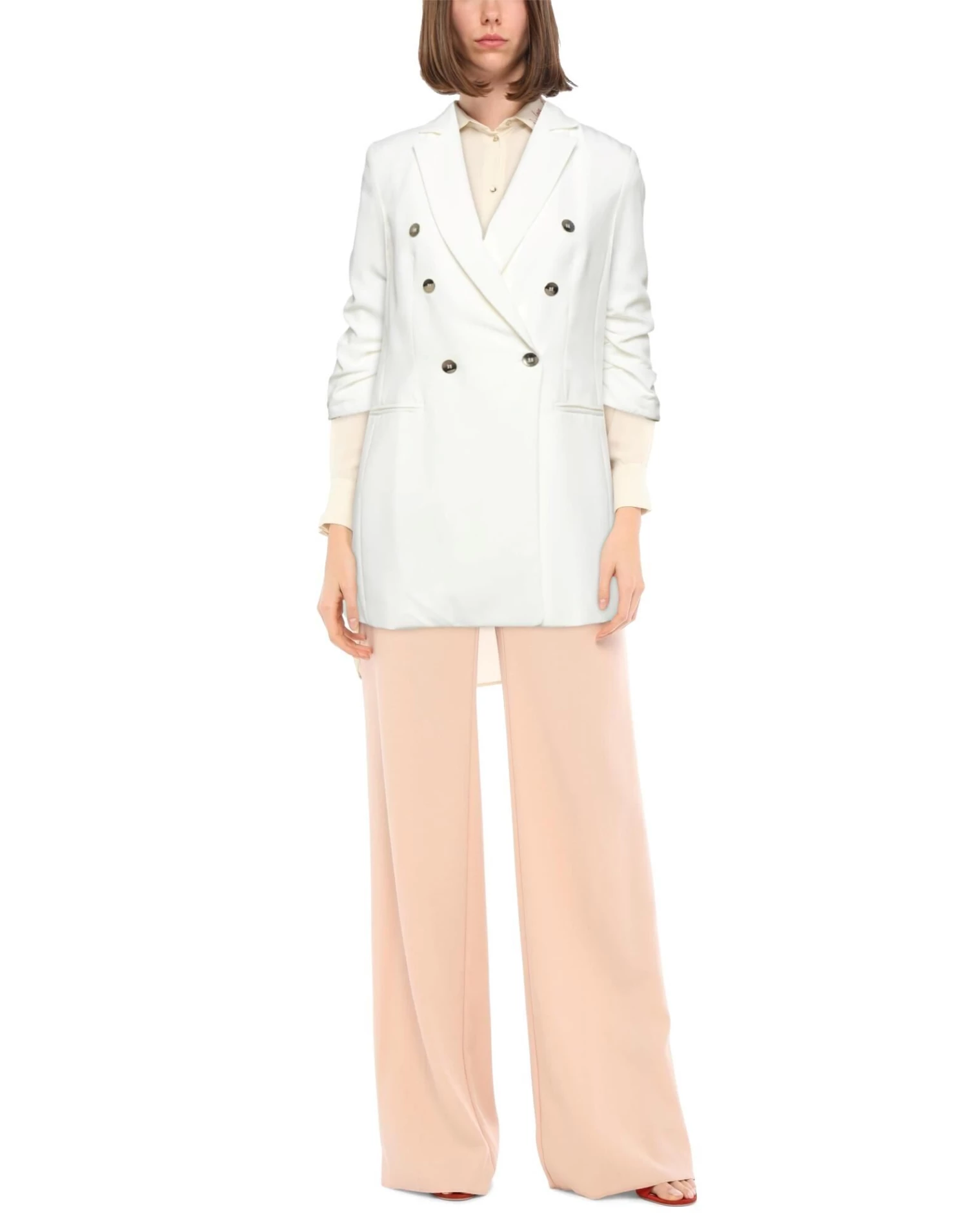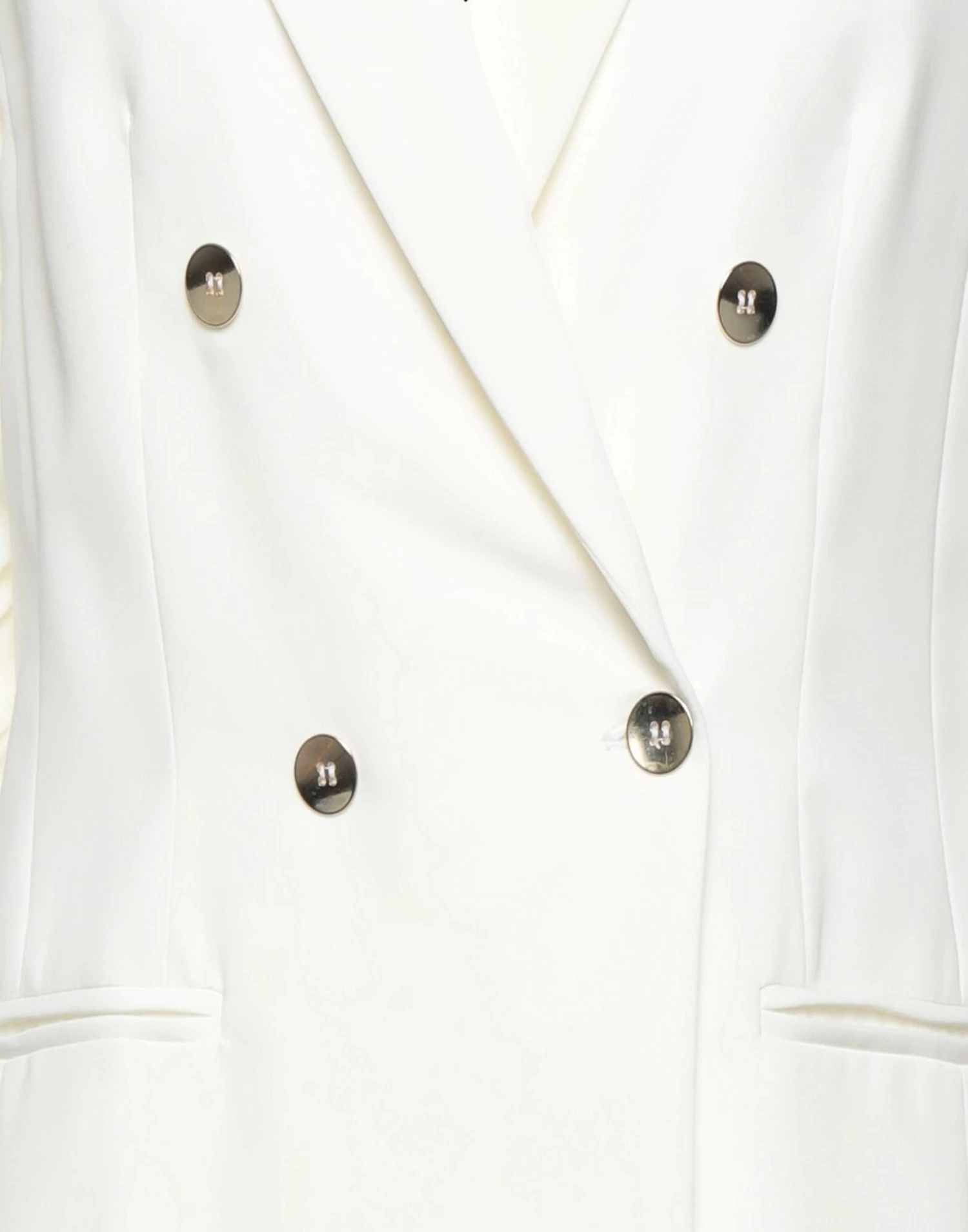 twill, laminated effect, no appliqués, solid color, lapel collar, double-breasted, 3/4 length sleeves, fully lined, button closing, multipockets, rear slit, stretch