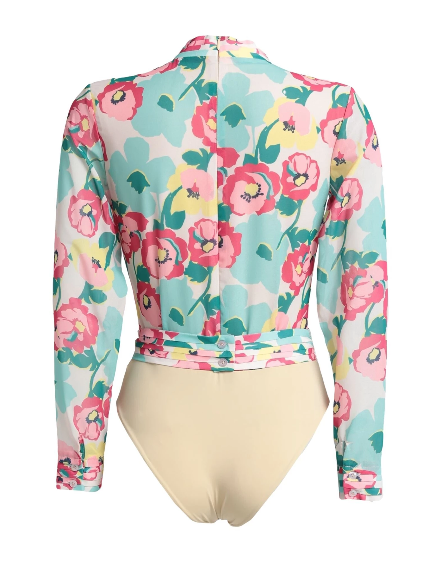 synthetic jersey, crepe, detachable application, folds, floral design, deep neckline, long sleeves, buttoned cuffs, partially lined interior, zipper closure, snap buttons fastening, crotch of body