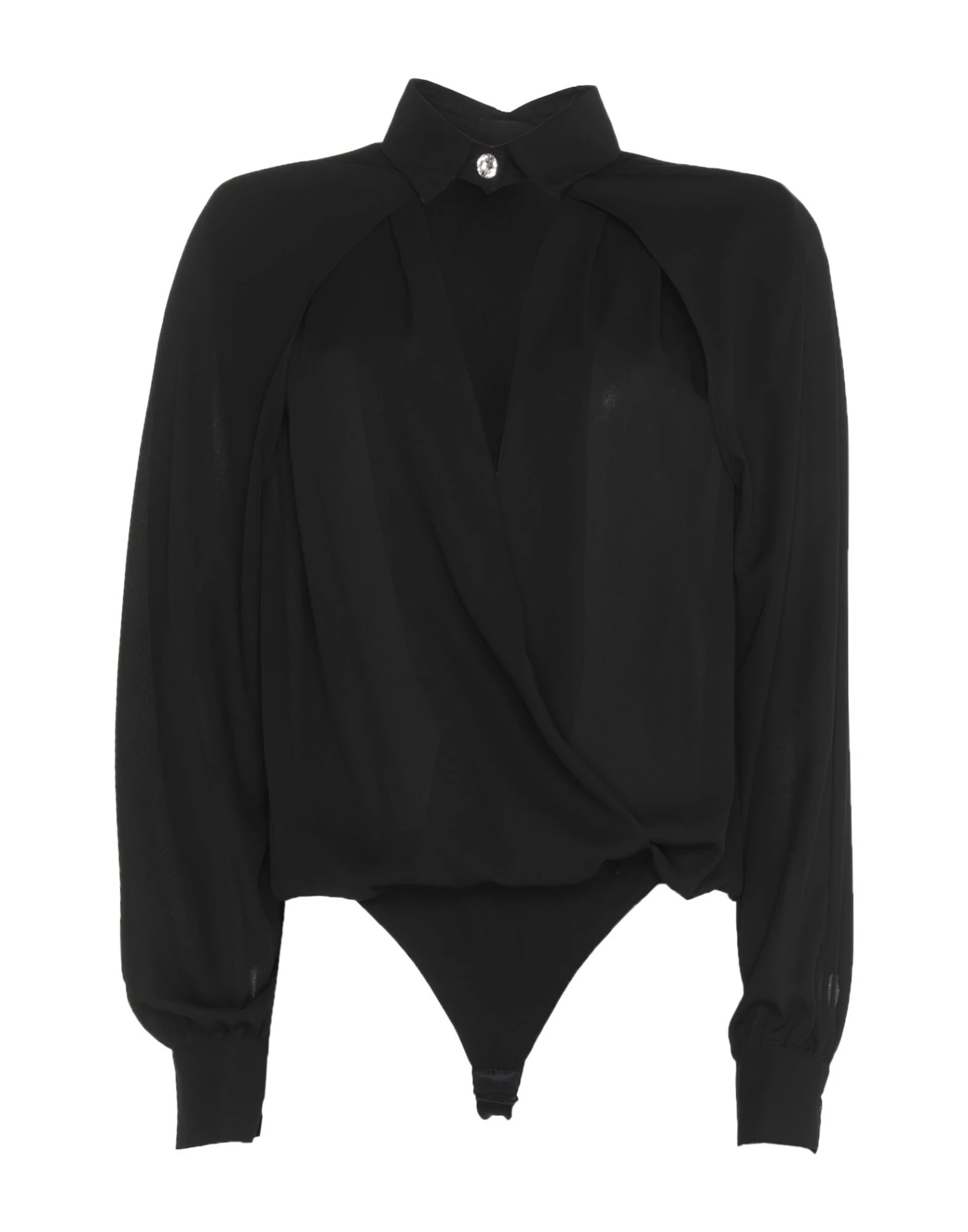 crepe, no appliqués, solid color, classic neckline, long sleeves, buttoned cuffs, front closure, button closing, no pockets, crotch of body