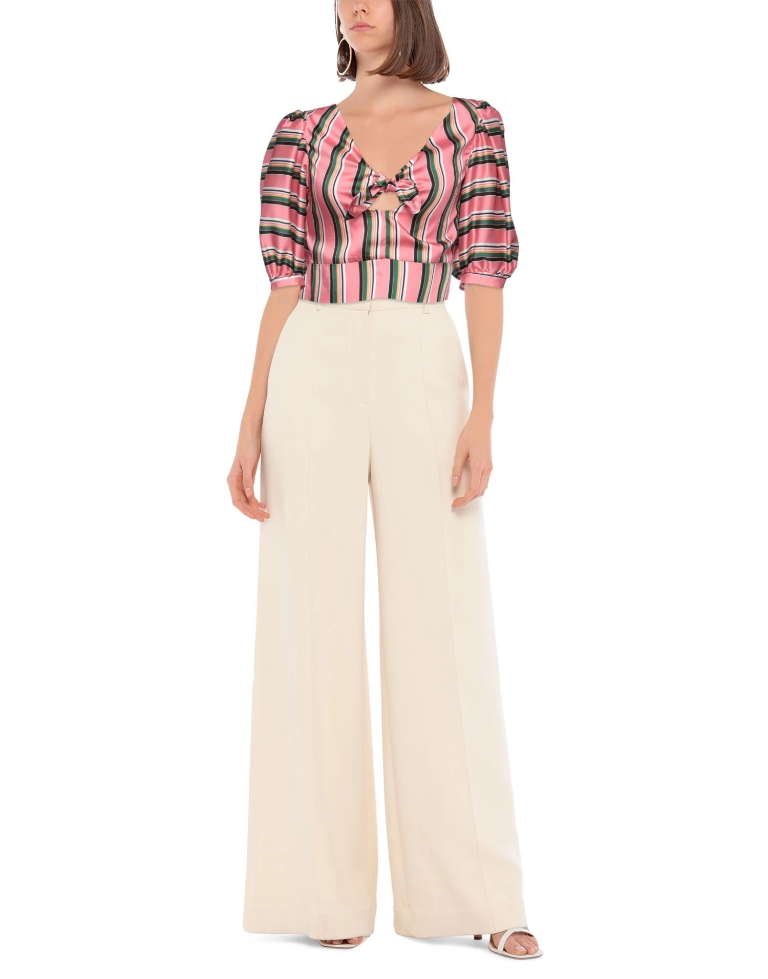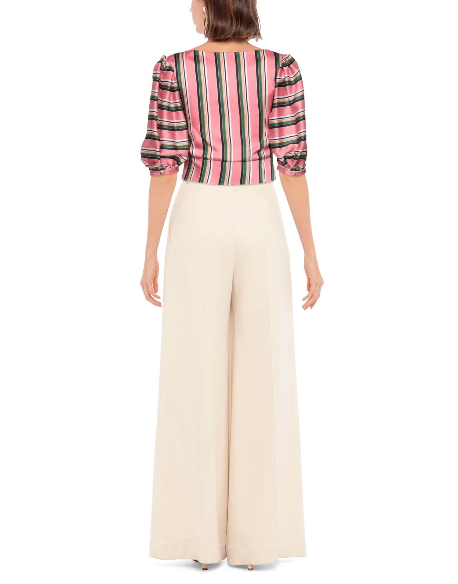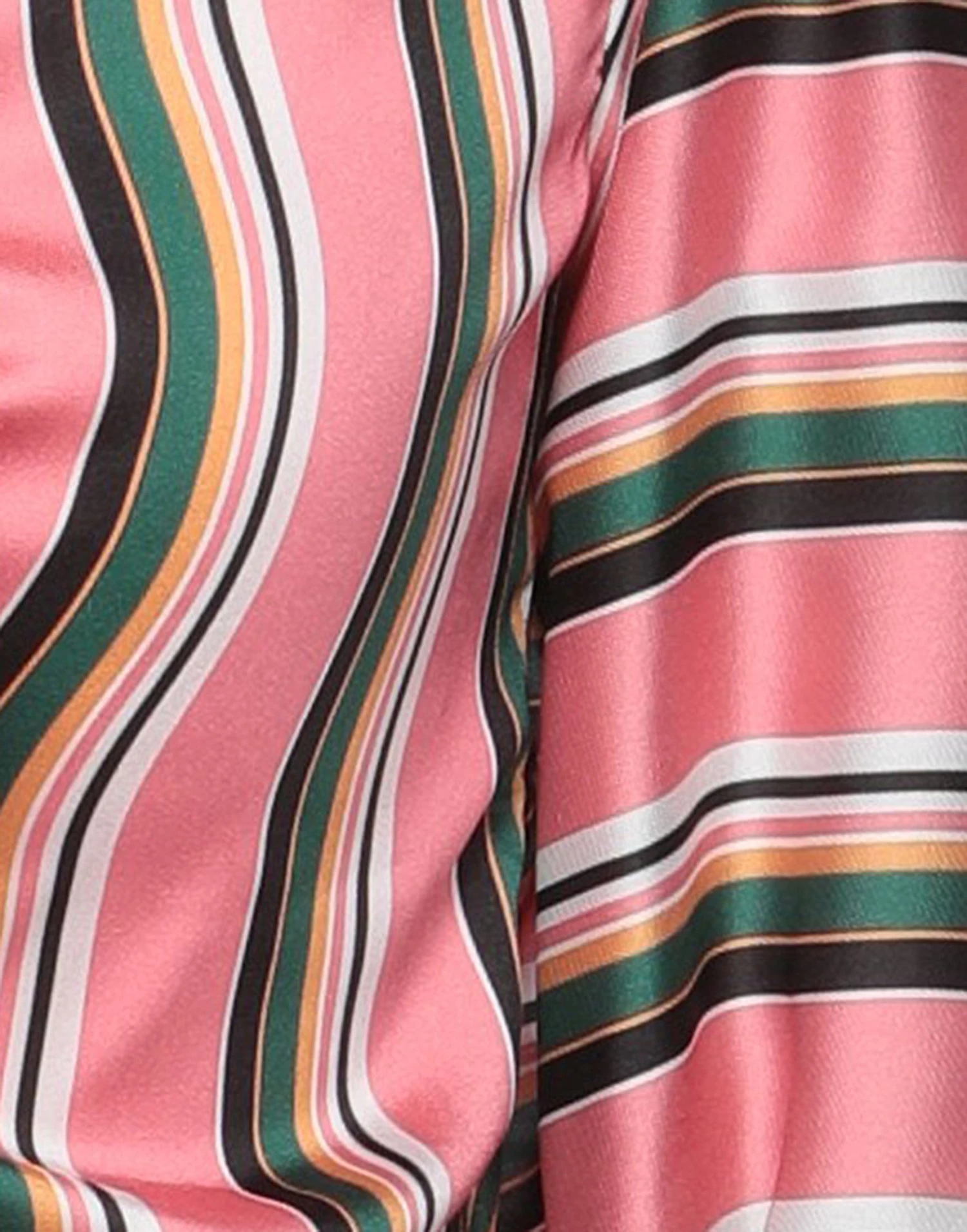 satin, frills, stripes, deep neckline, short sleeves, buttoned cuffs, fully lined, zipper closure