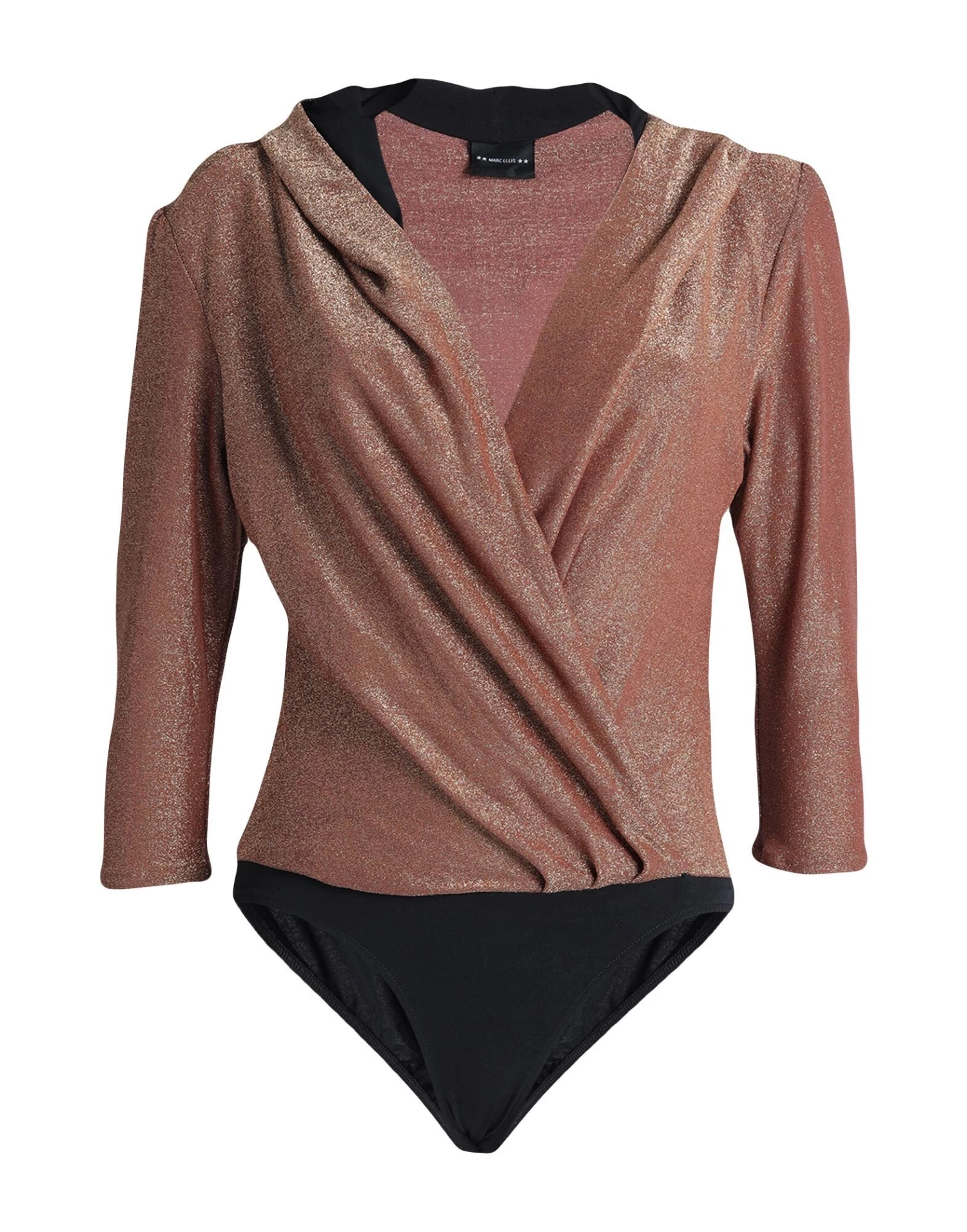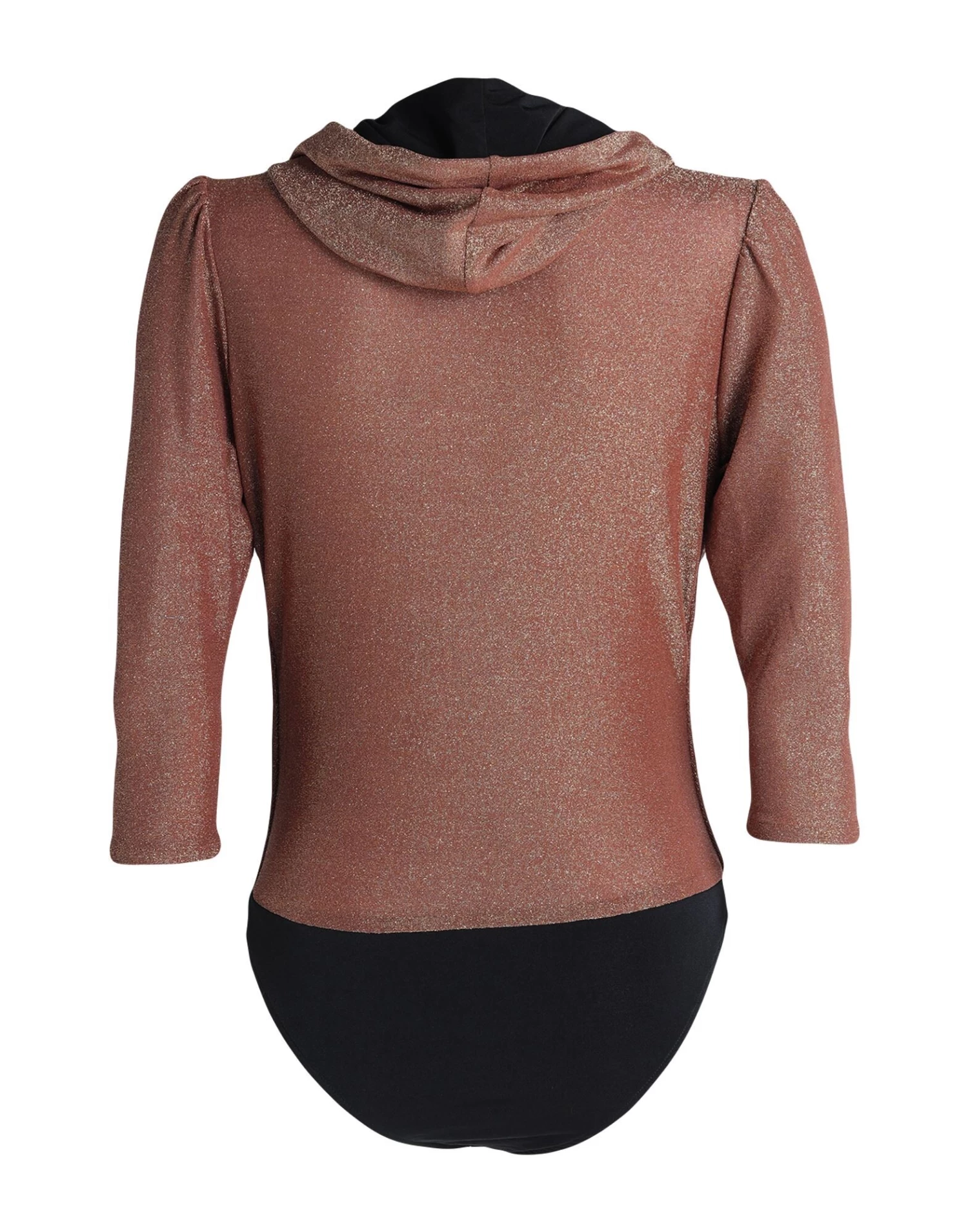 jersey, lamé, draped detailing, two-tone, hooded collar, 3/4 length sleeves, snap buttons fastening, crotch of body, stretch