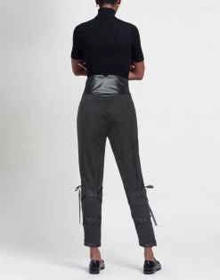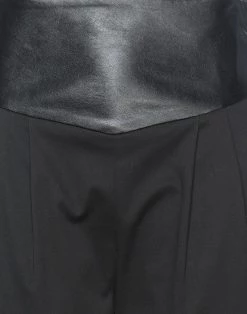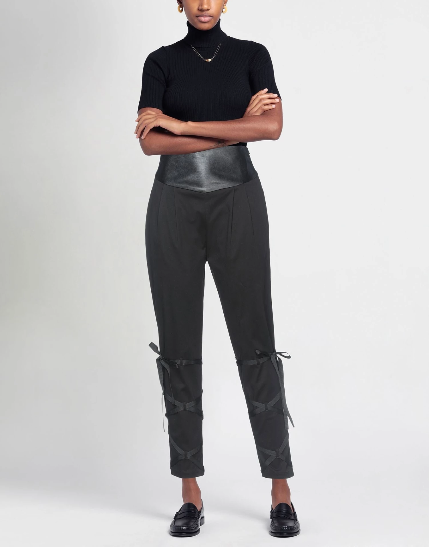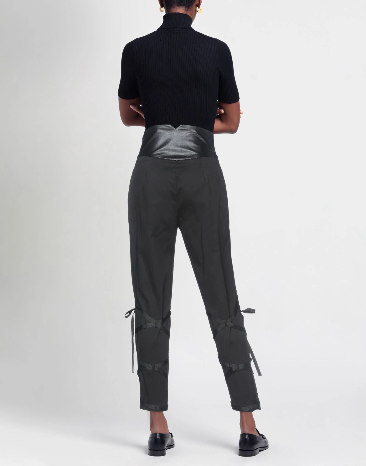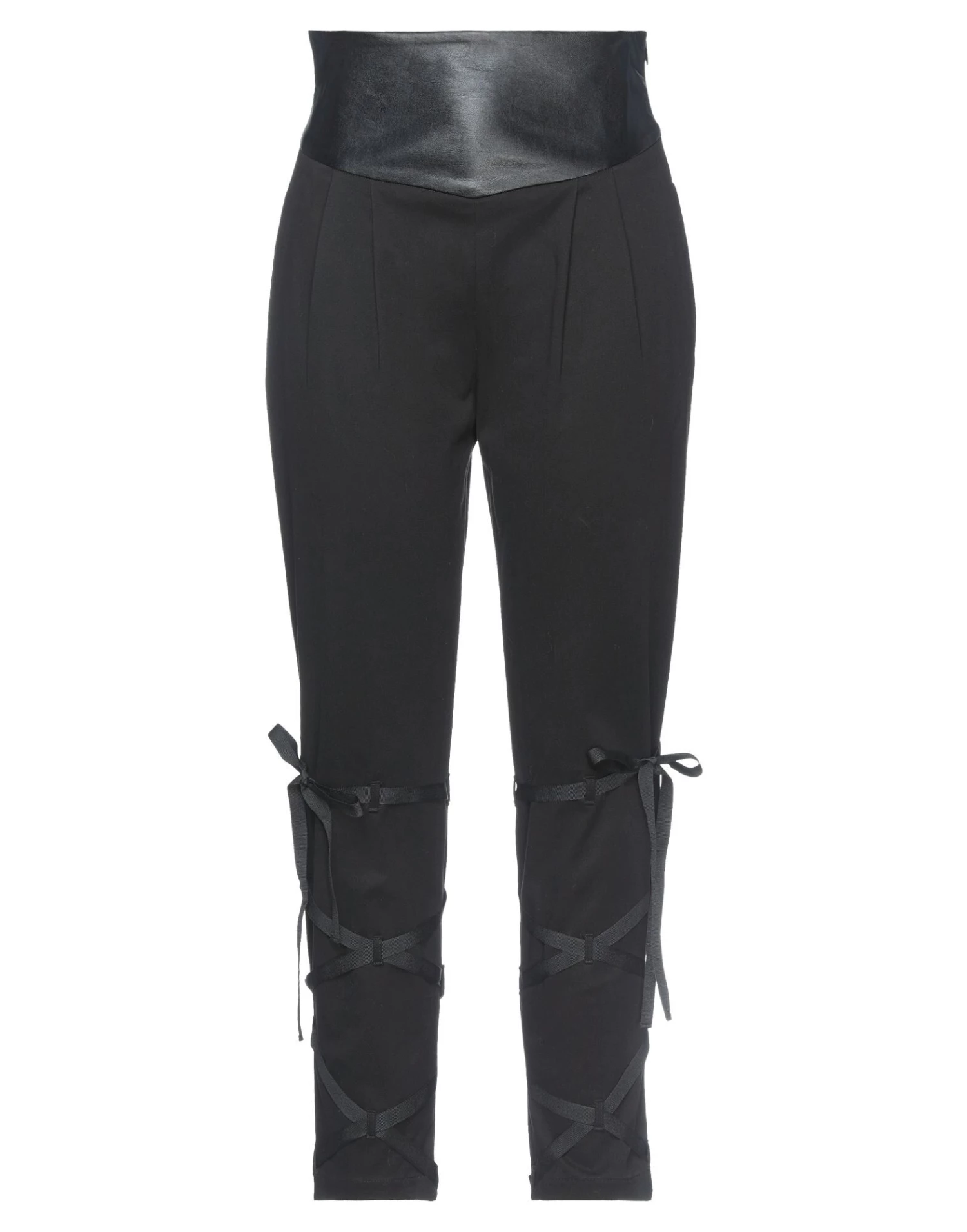 coated fabric, plain weave, laces, solid color, high waisted, tapered leg, regular fit, zipper closure, no pockets, stretch