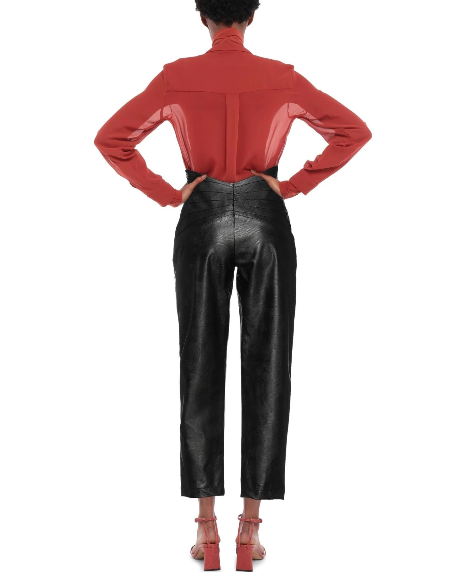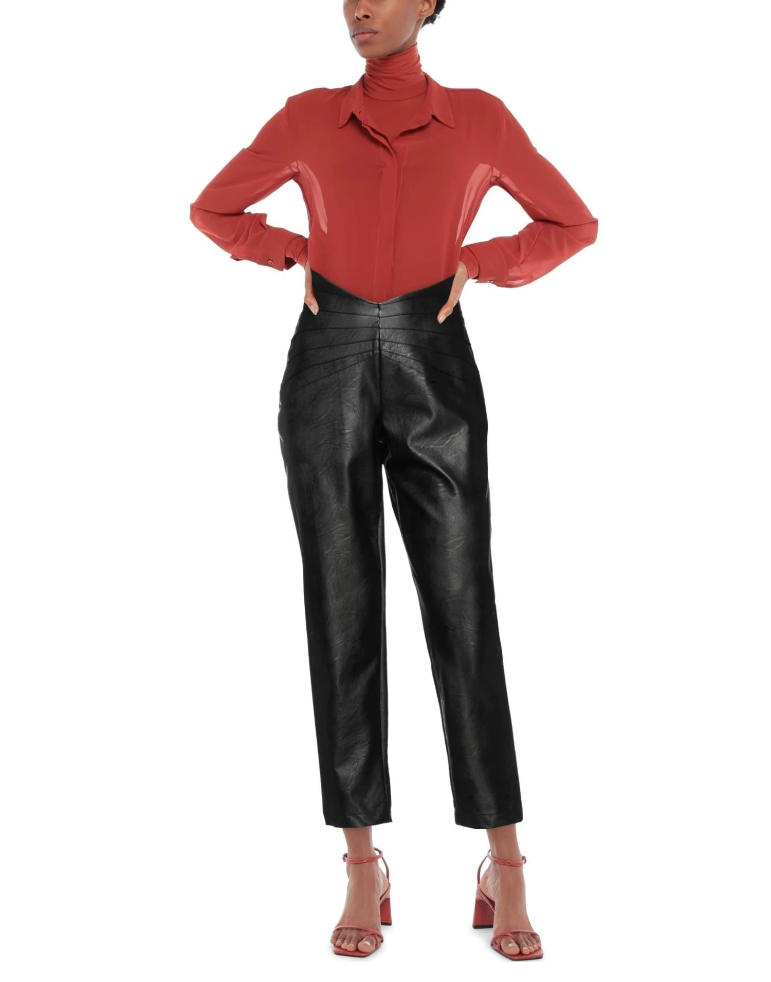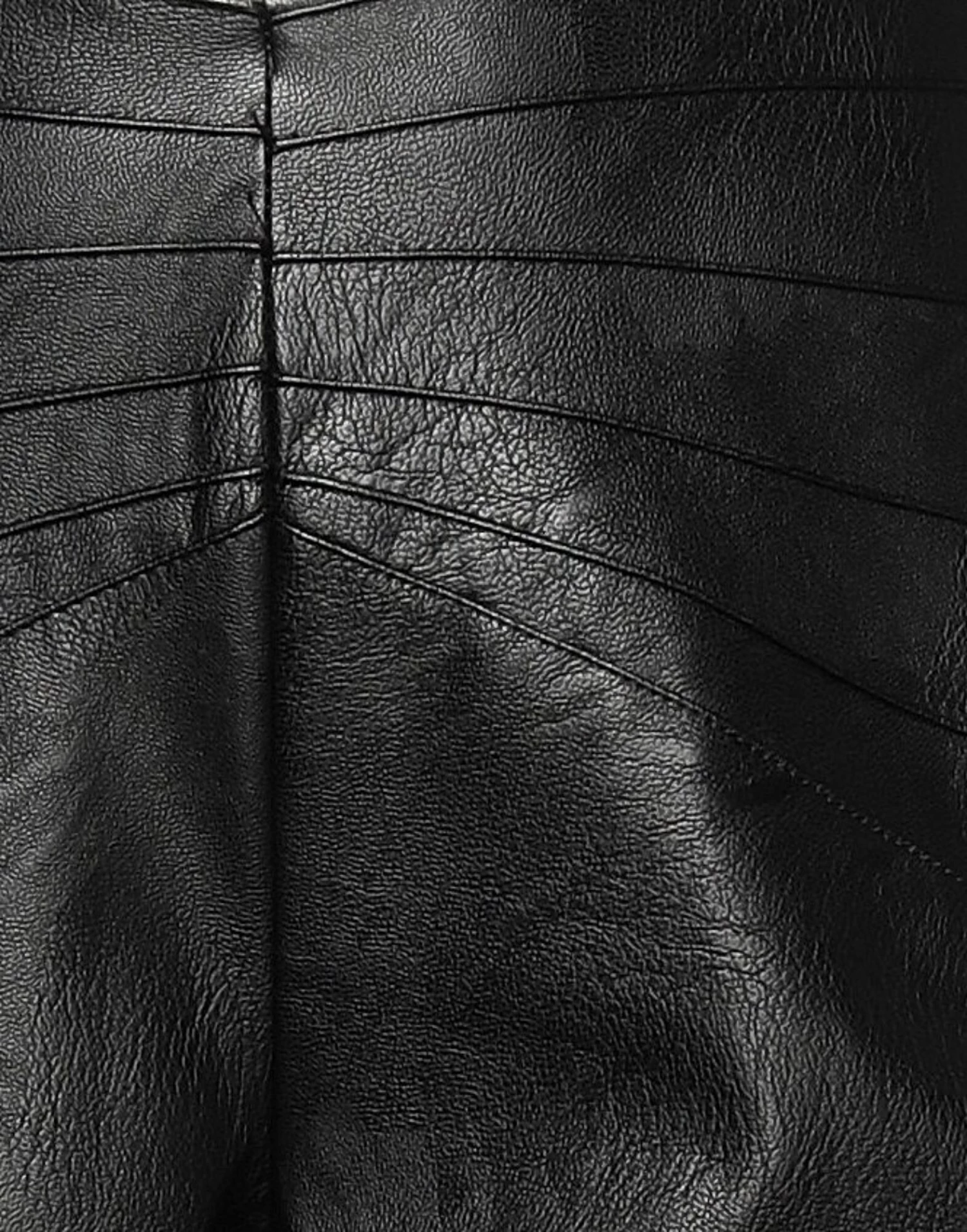 coated fabric, no appliqués, solid color, mid rise, tapered leg, regular fit, zipper closure, no pockets
