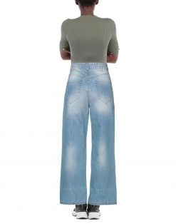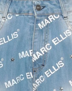 denim, faded, metal applications, logo design, medium wash, high waisted, straight leg, regular fit, zipper closure, button closing, multipockets