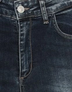 denim, faded, brand logo, studs, solid color, dark wash, high waisted, belt loops, 1 button, zipper closure, multipockets, stretch