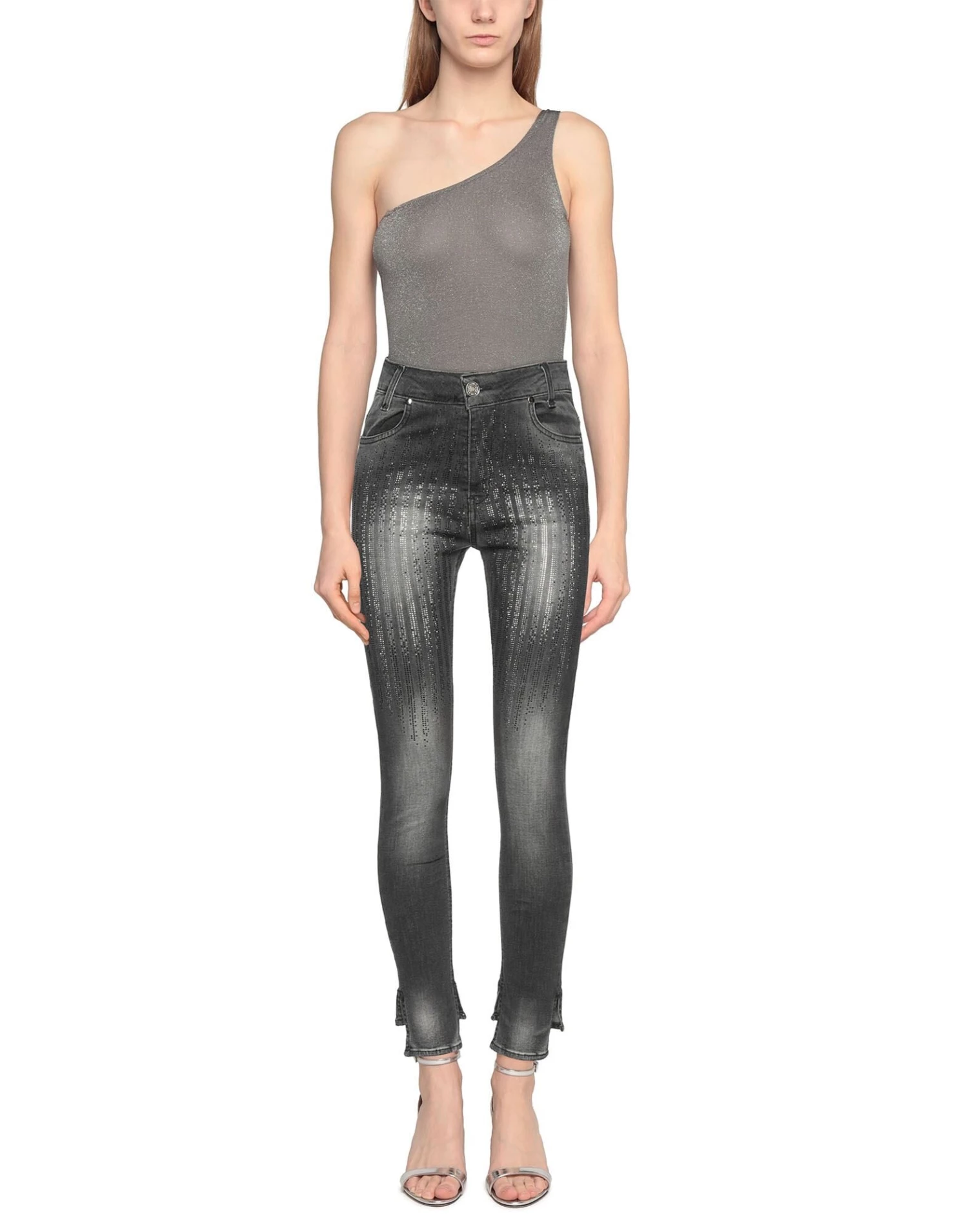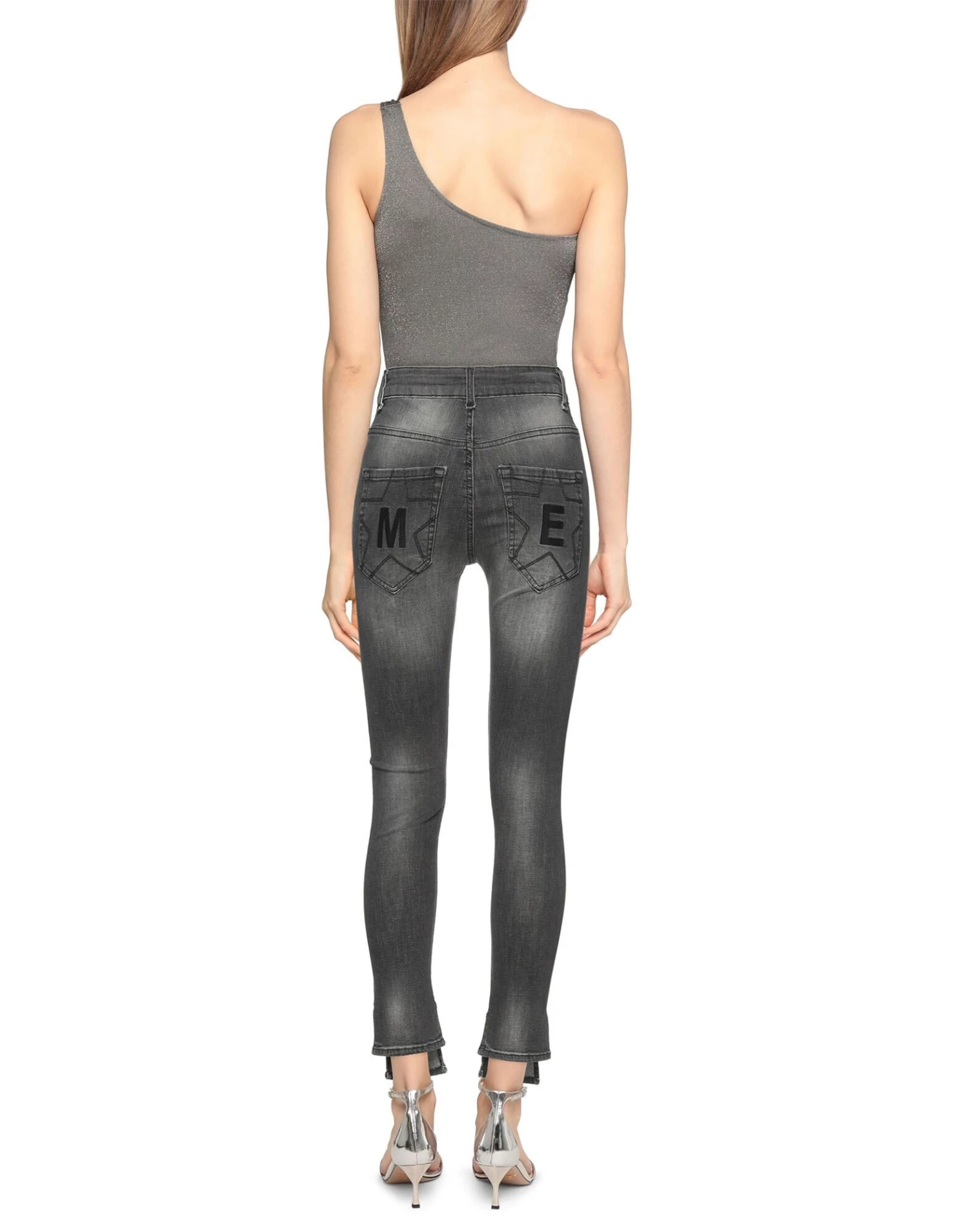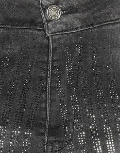 denim, faded, brand logo, rhinestones, solid colour with appliqués, colored wash, mid rise, tapered leg, slim-leg pants, button closing, zipper closure, multipockets, side slit hemline, stretch