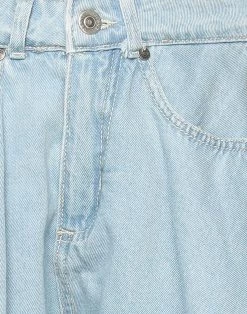 denim, brand logo, solid color, light wash, high waisted, belt loops, 1 button, zipper closure, fringed hem, five pockets