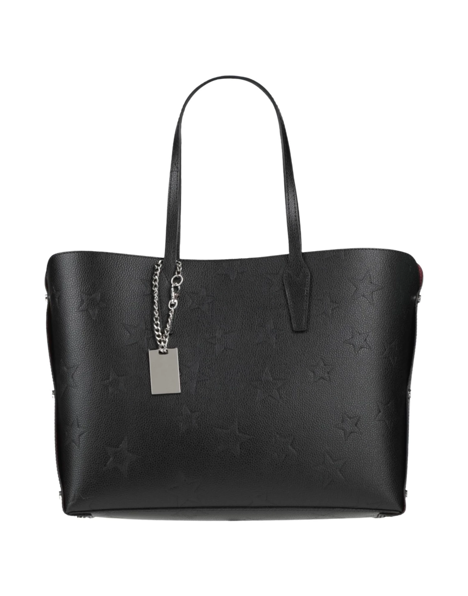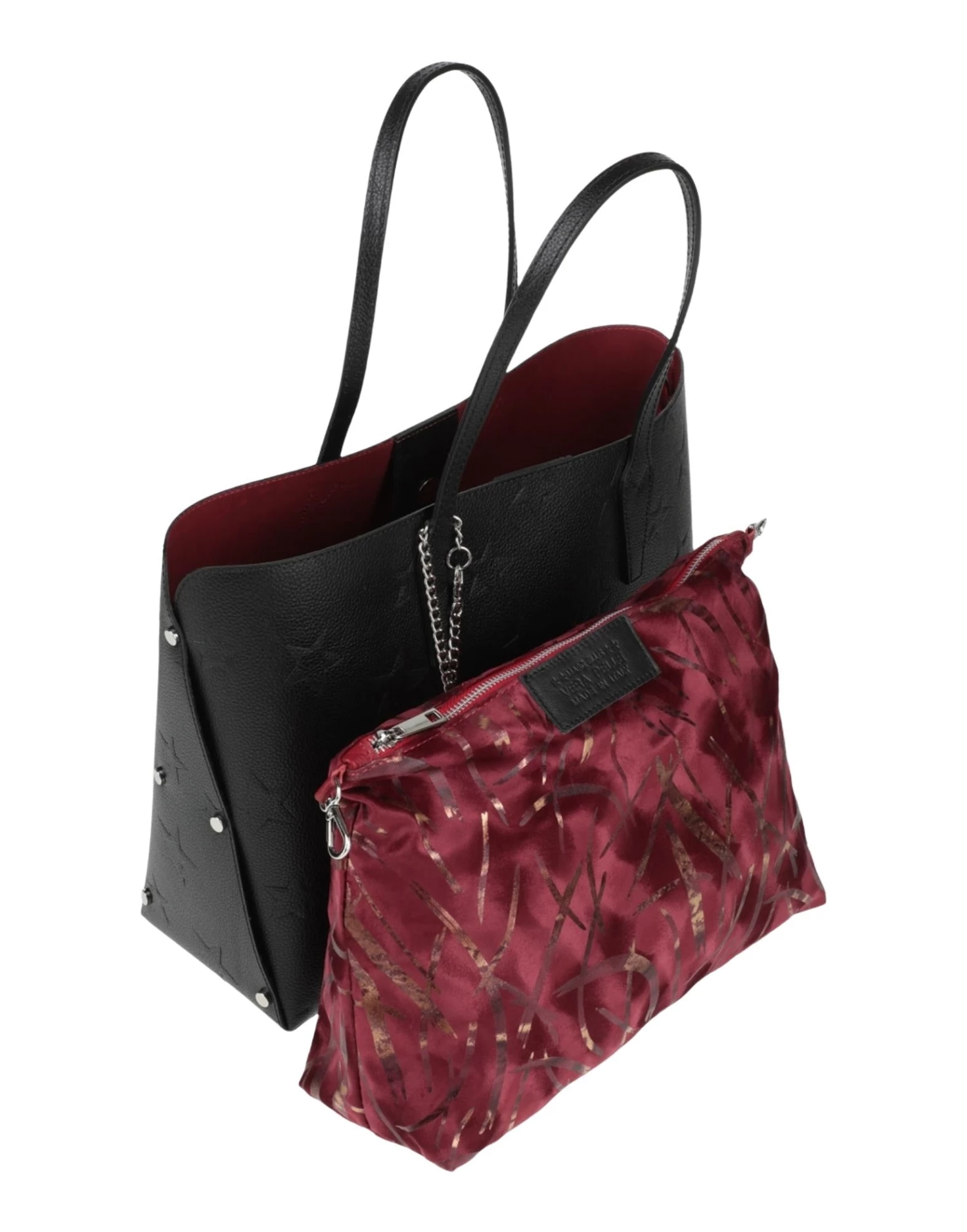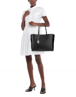 leather, textured leather, detachable application, logo, solid color, double handle, snap buttons fastening, leather lining, removable computer pouch, contains non-textile parts of animal origin, bottom with studs, daytime, large