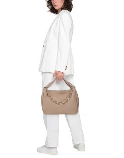 large, leather, textured leather, brand logo, solid color, fully lined, zipper closure, internal zip pocket, detachable shoulder strap, daytime, contains non-textile parts of animal origin