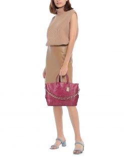 large, leather, crocodile print, detachable application, brand logo, solid color, fully lined, zipper closure, internal pockets, double handle, detachable shoulder strap, leather straps, bottom with studs, daytime, contains non-textile parts of animal origin