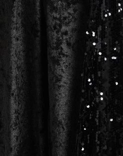 velvet, tulle, glitter print, sequins, solid colour with appliqués, deep neckline, sleeveless, partially lined interior, no pockets, stretch