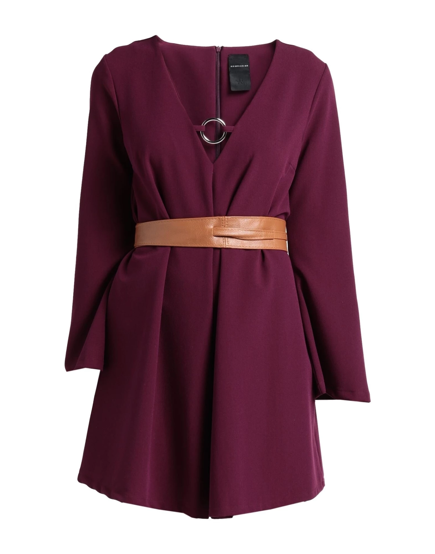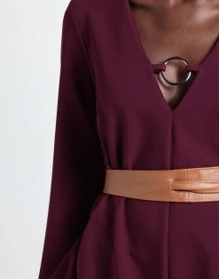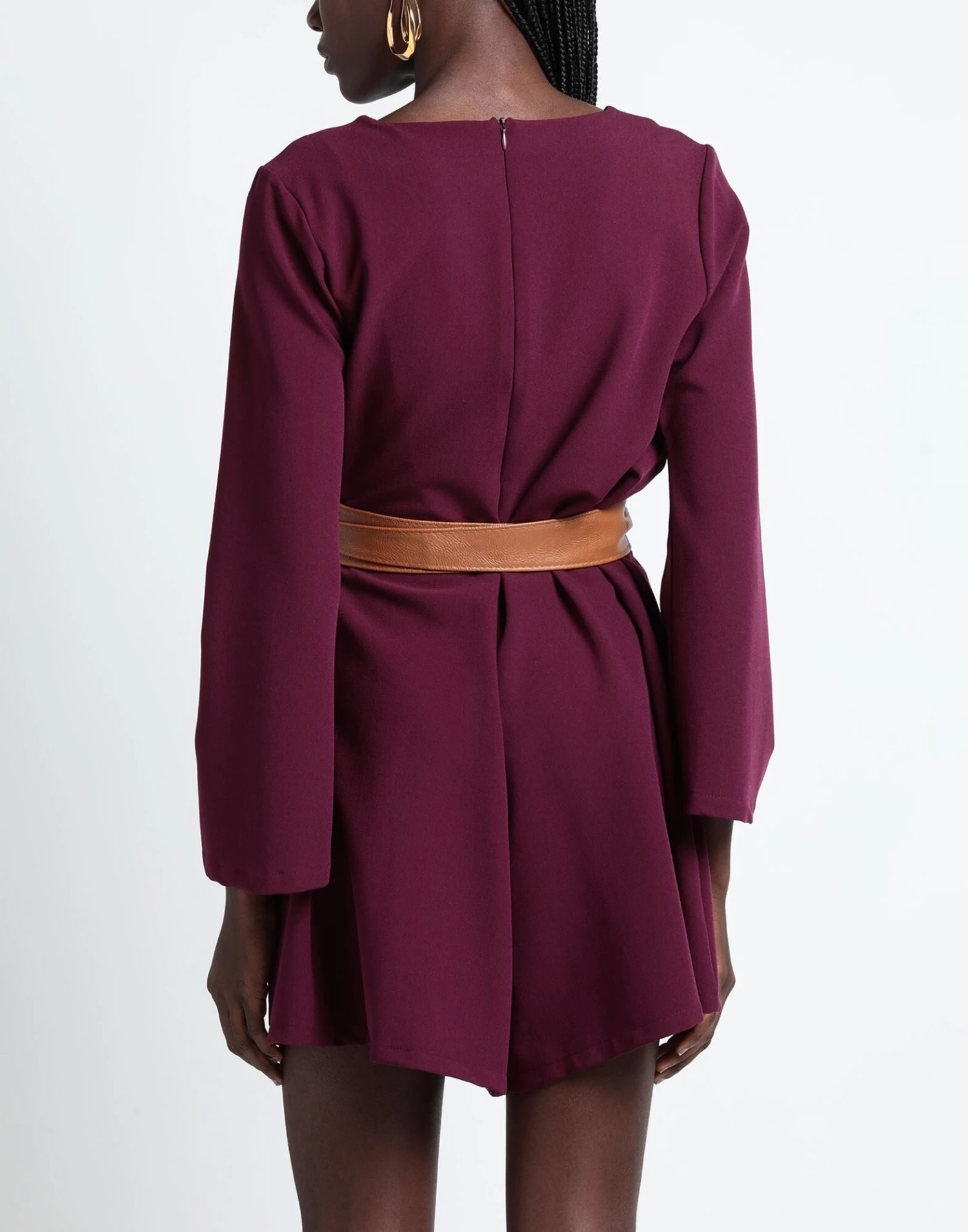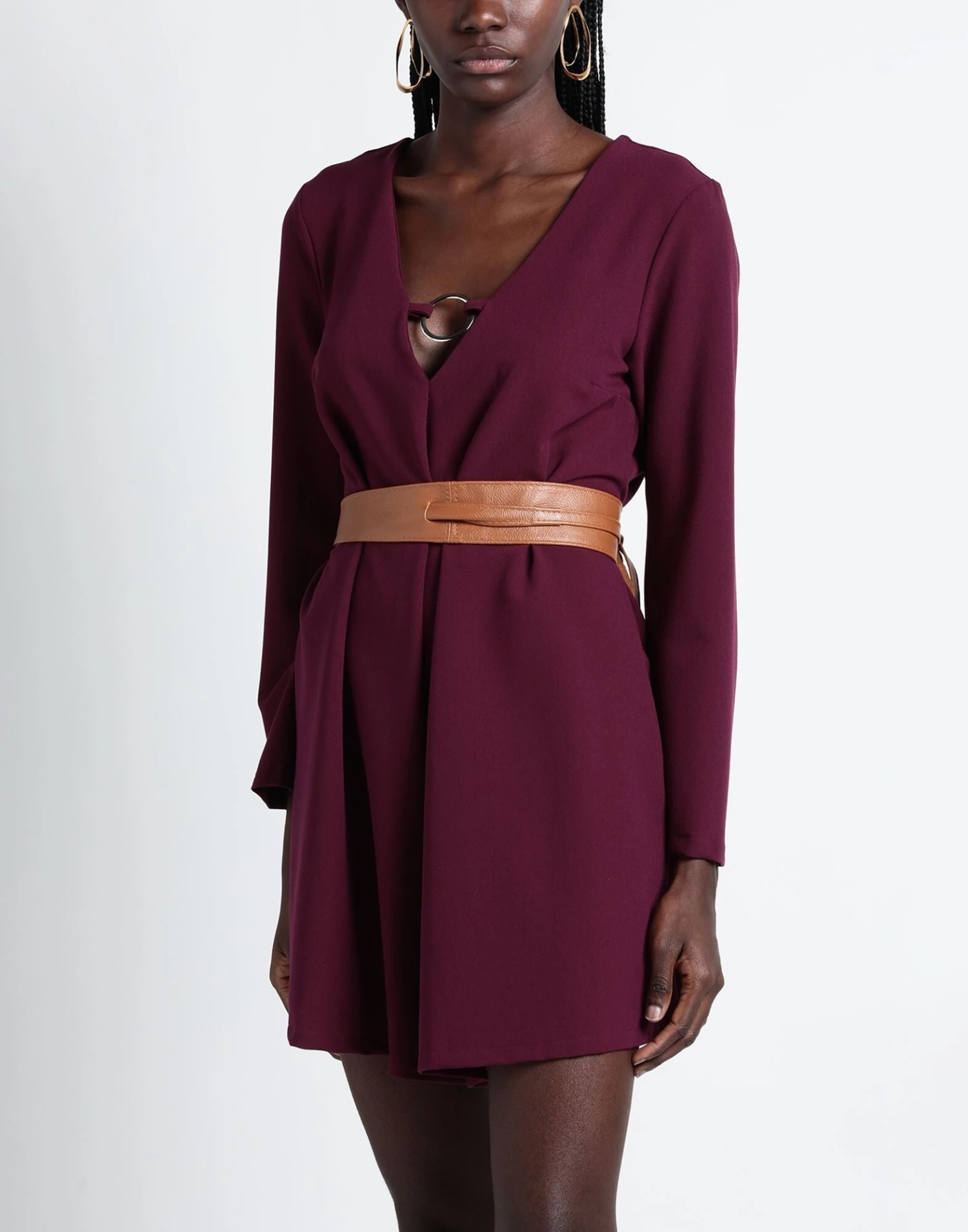 crepe, metal applications, belt, solid colour with appliqués, deep neckline, long sleeves, zipper closure, no pockets, stretch