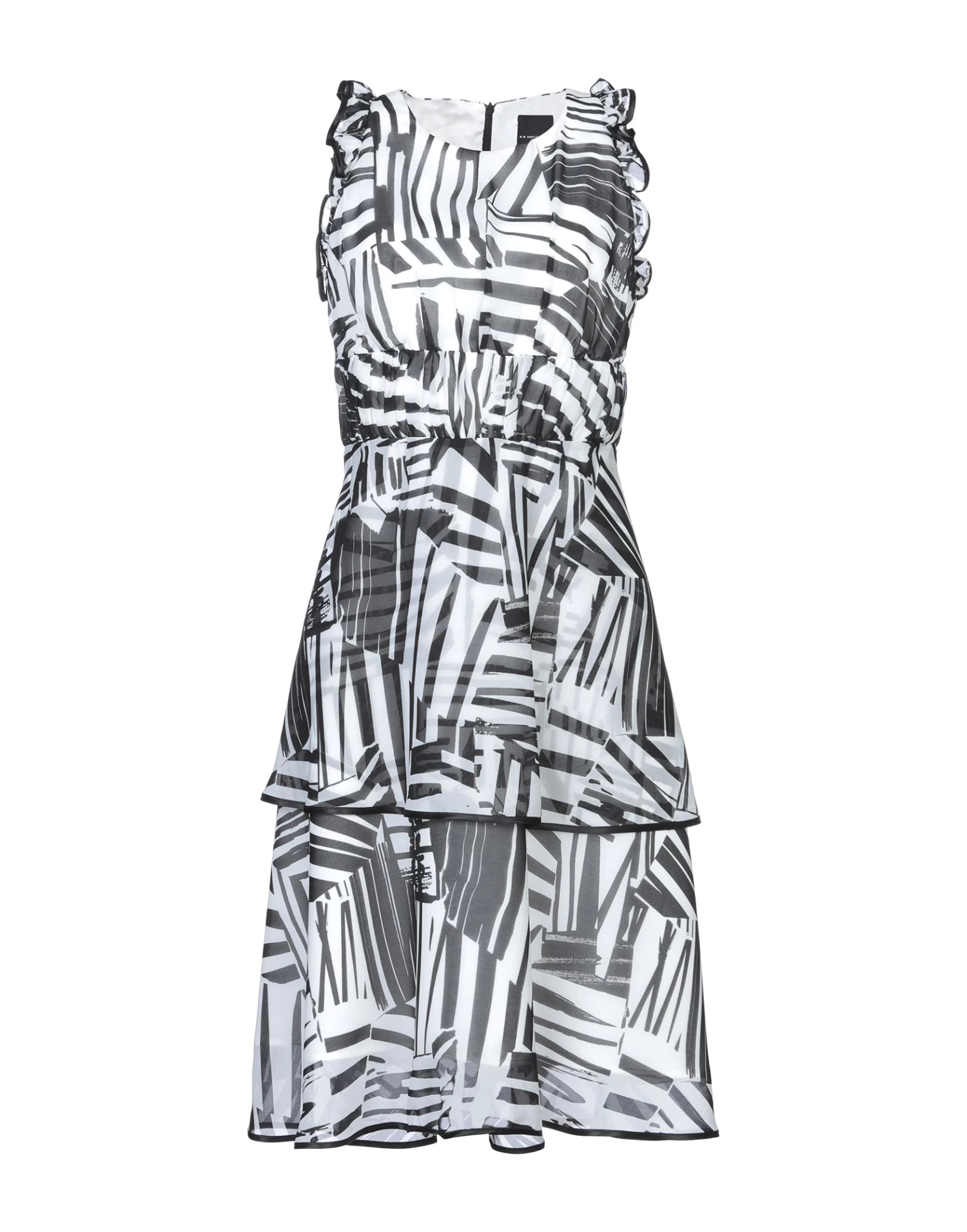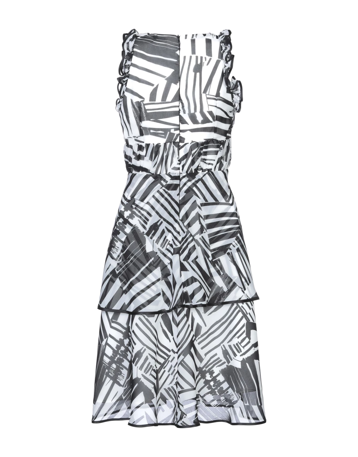 crepe, plain weave, frills, two-tone, round collar, sleeveless, no pockets, rear closure, fully lined, zip