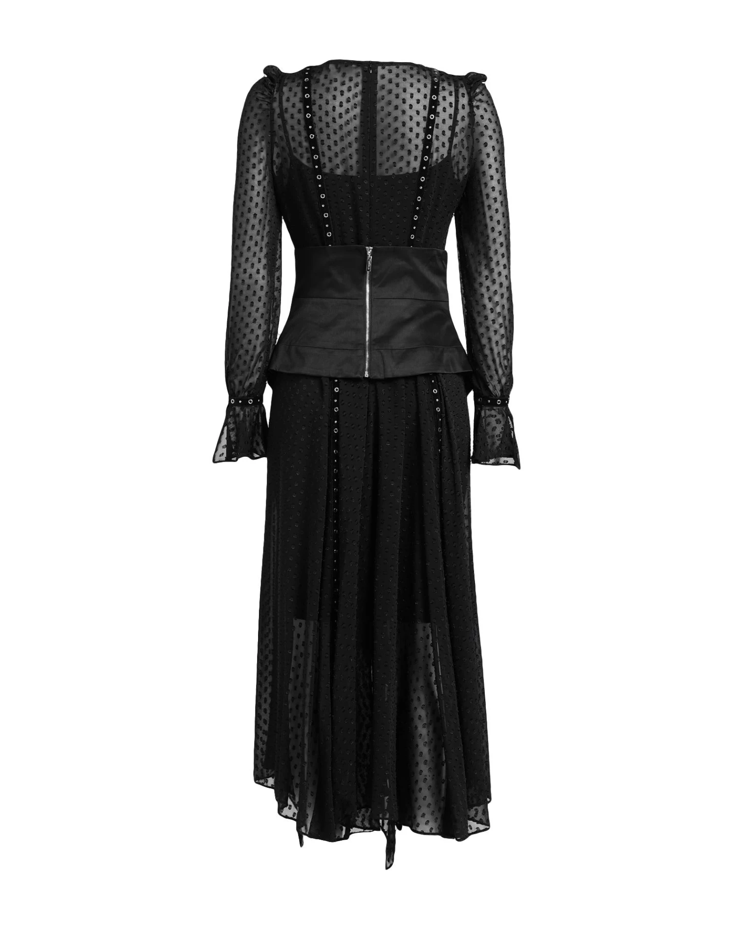crepe, contrasting applications, solid colour with appliqués, round collar, long sleeves, slip to line, zipper closure, no pockets, 2-piece set