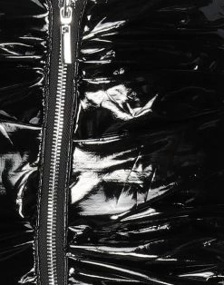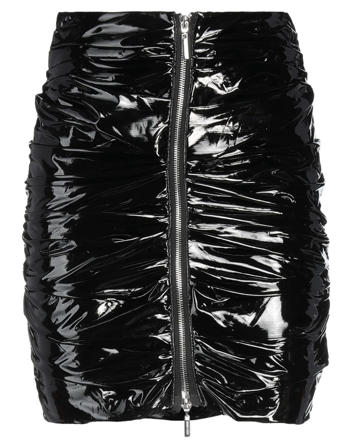coated fabric, varnished effect, frills, solid color, zipper closure, no pockets, fully lined, pencil style