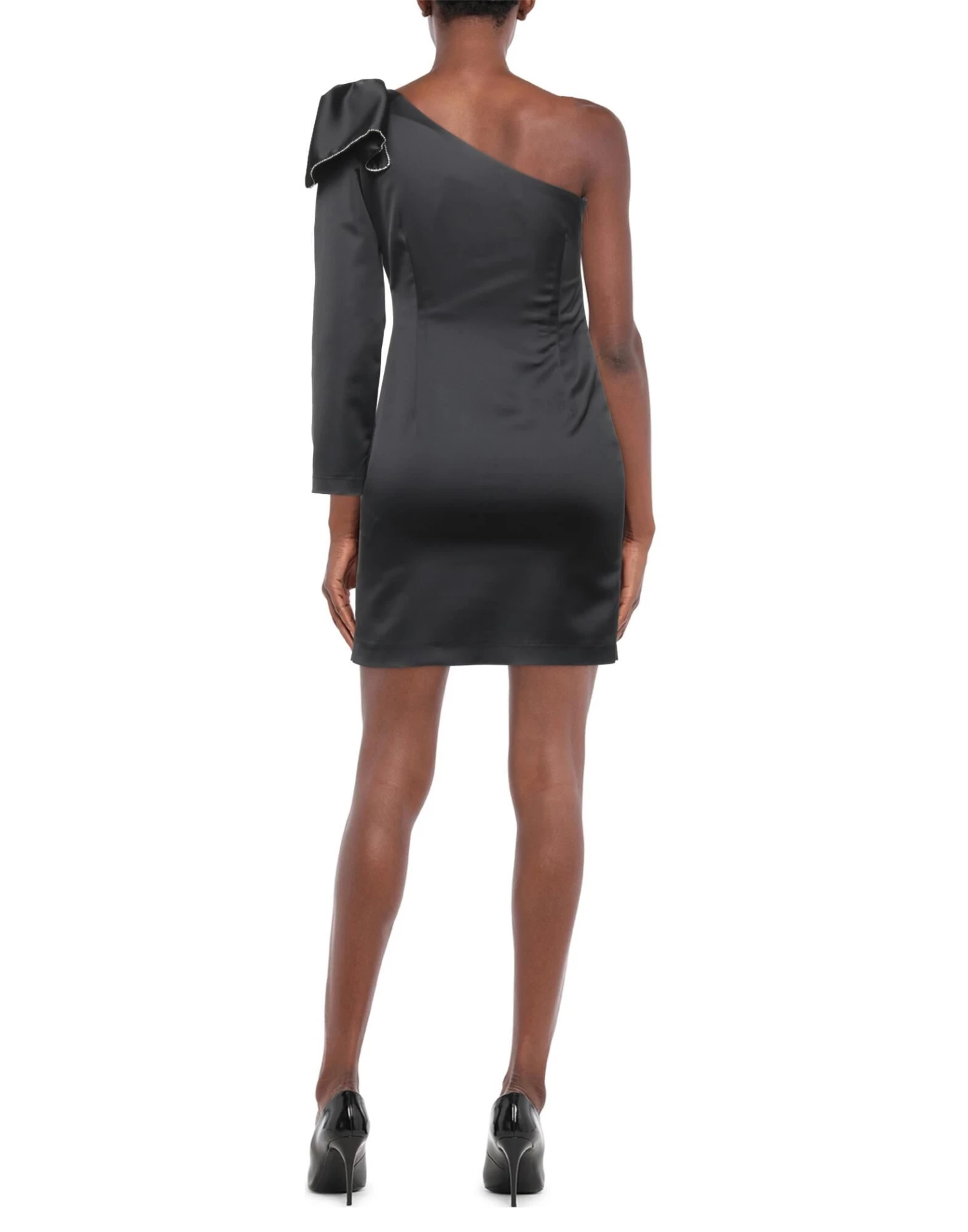 satin, bow-detailed, rhinestones, solid color, deep neckline, one-shoulder, unlined, zipper closure, no pockets, stretch